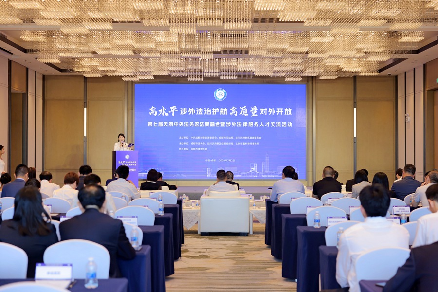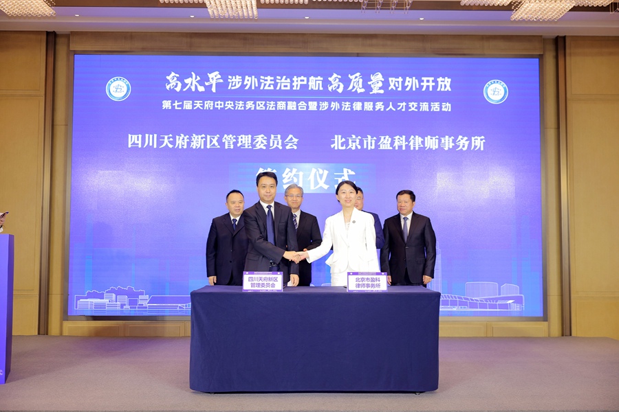 由成都市委政法委、成都市司法局、四川天府新区管委会联合主办的第七届天府中央法务区法商融合暨涉外法律服务人才交流活动在天府中央法务区举行。活动以“高水平涉外法治护航高质量对外开放”为主题,现场揭牌天府中央法务区“法务+对外开放”工作站、盈科全球一小时法律服务生态圈四川涉外中心,举行政企合作协议签约仪式。
